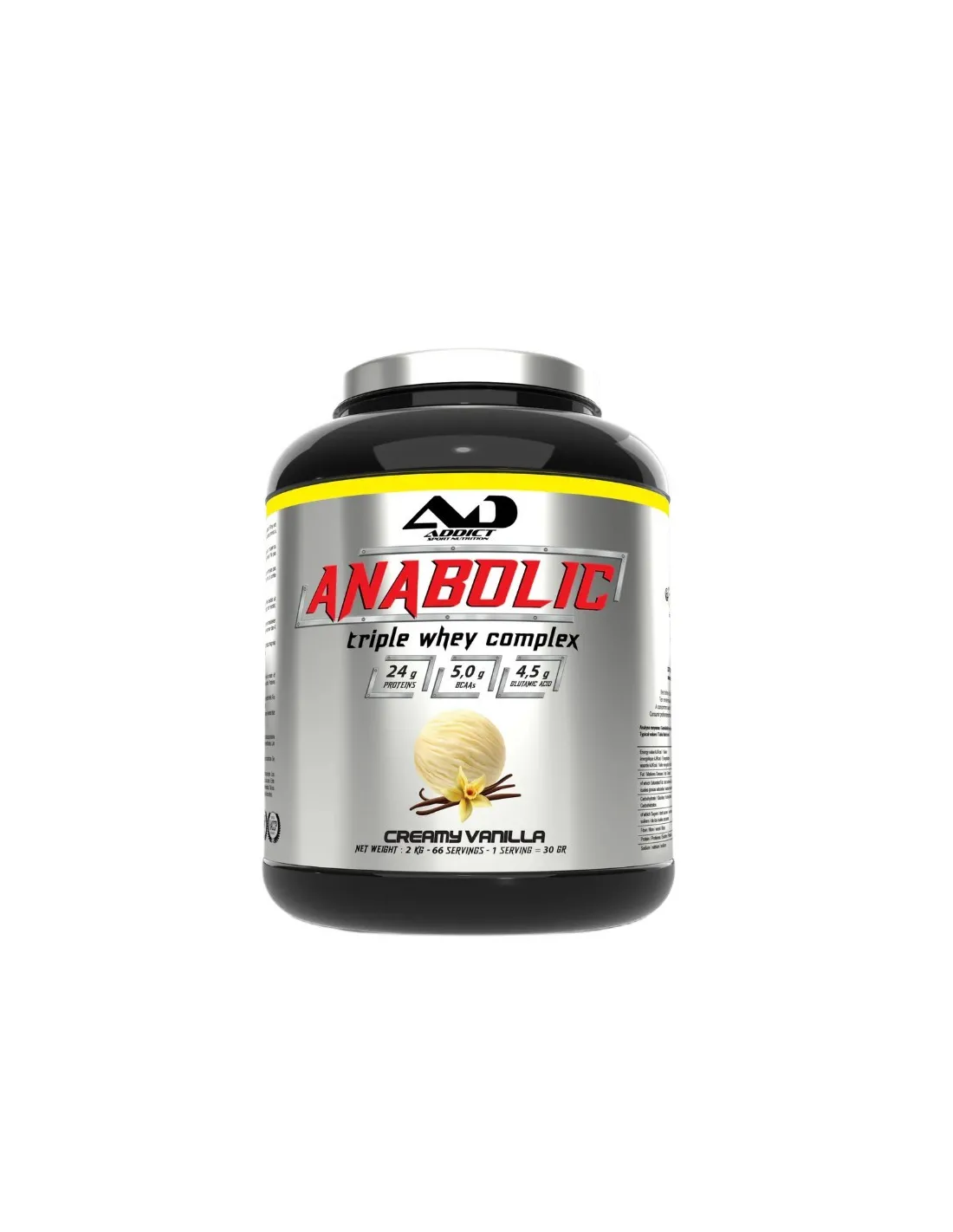 Our Anabolic Whey is composed per service of 30g of 24g of tri-sources of whey, Whey protein concentrate (75%), whey protein isolate (15%), hydrolyzed whey protein (10%) or a rate of 80%, 10,000 mg of BCAA, 3,700 mg of Glutamine.