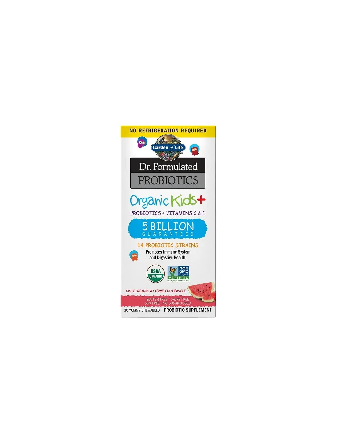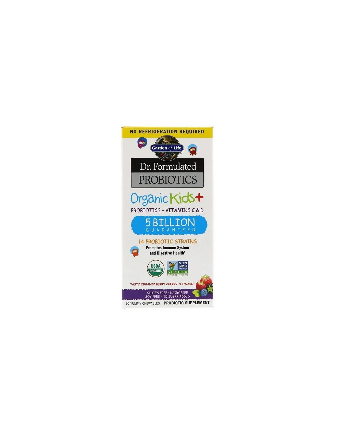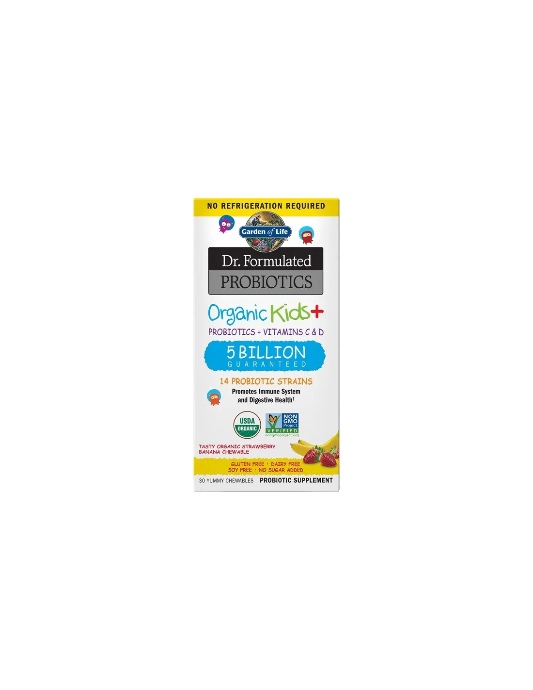 Dr. Formulated Probiotics Organic Kids+ es un delicioso probiótico masticable certificado ecológico por la USDA y verificado por el Proyecto No GMO, sin azúcares ni edulcorantes añadidos, diseñado para crear un microbioma sano y favorecer la salud digestiva e inmunitaria de los niños.
