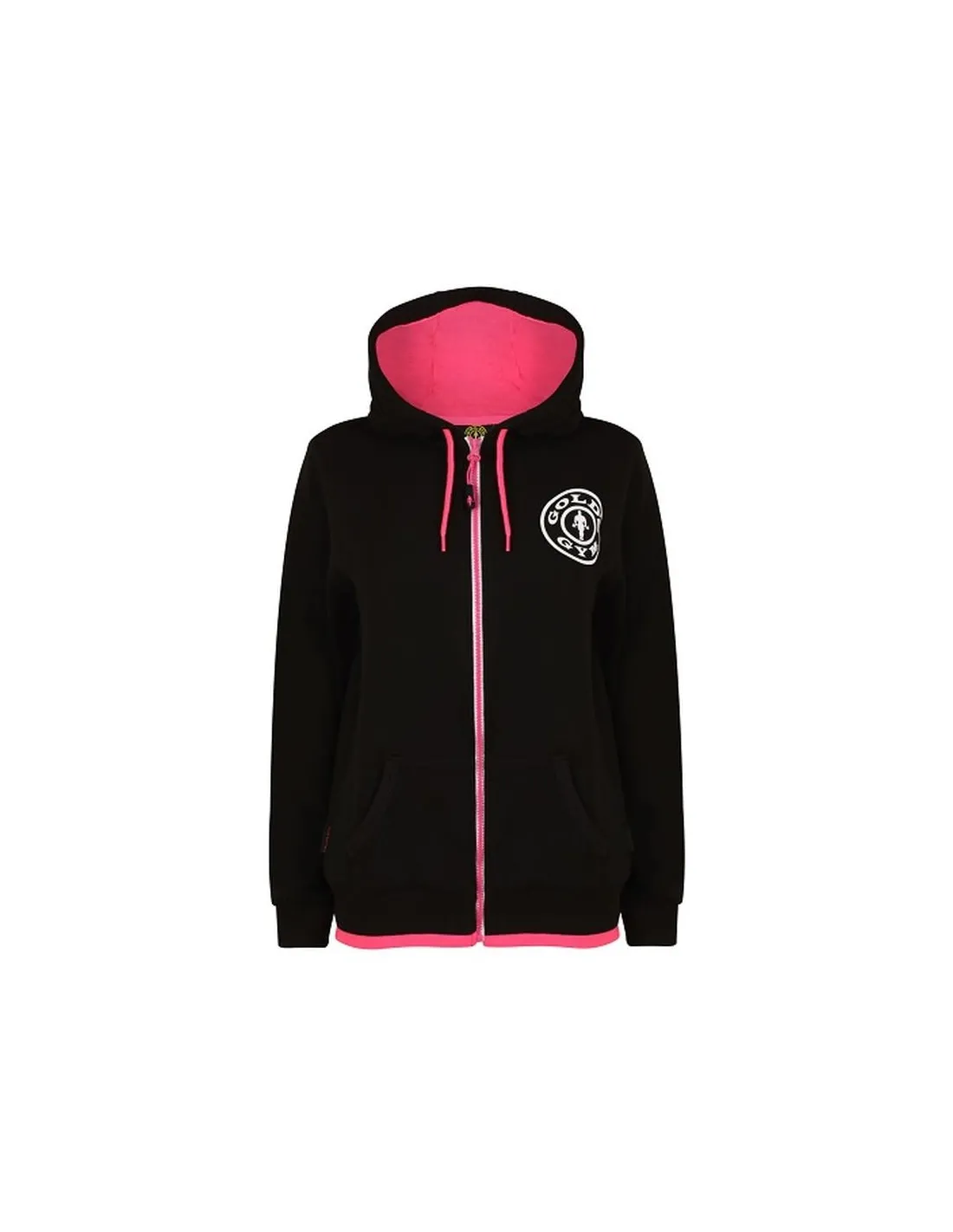La cómoda sudadera con capucha Golds Gym Zipper para mujer es mayoritariamente negra, pero también tiene aplicaciones rosas como el interior de la capucha y los cordones y la cremallera de la sudadera. Las combinaciones de colores son perfectas para llevar con casi todo. También cuenta con una gran impresión de la espalda de Muscle Joe en blanco y el logotipo de la placa de pesas de Golds Gym más pequeño en el pecho izquierdo.