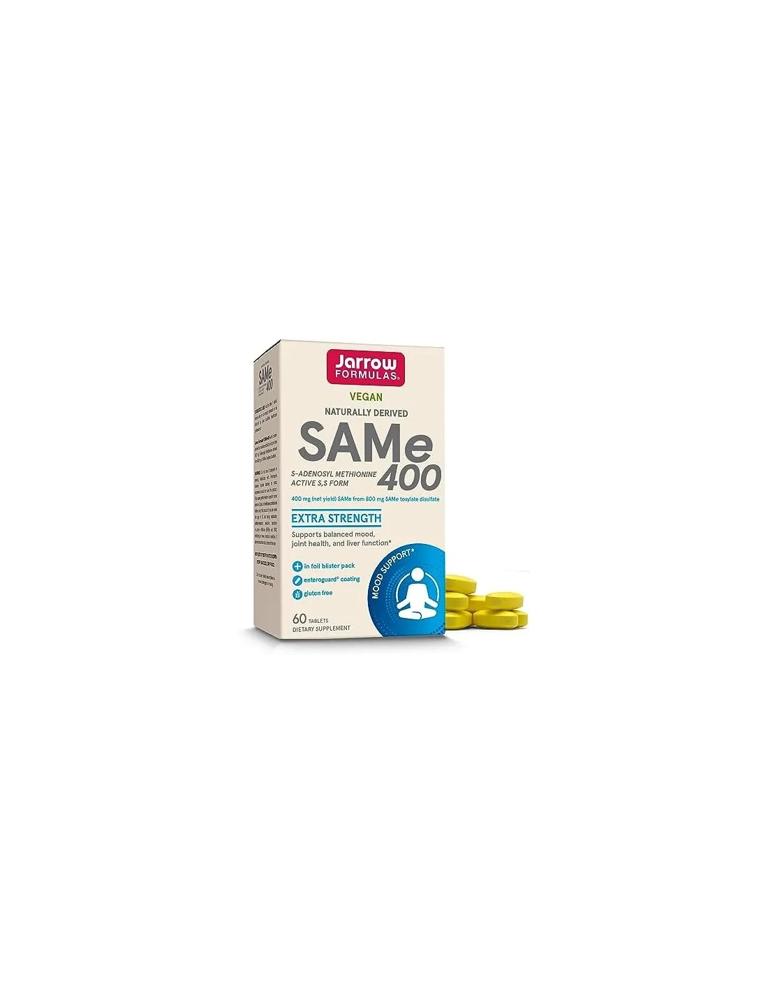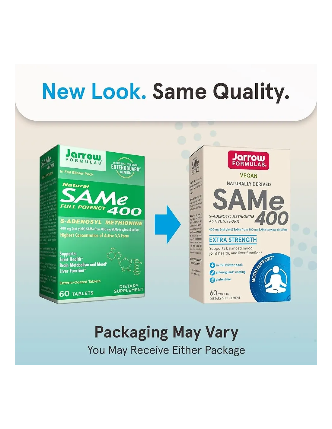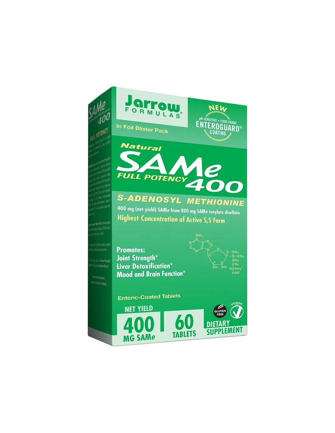 Jarrow Formulas SAMe 400 proporciona una alta dosis de 400 mg de S-adenosilmetionina (SAMe), equivalente al contenido neto, de 800 mg de SAMe tosilato disulfato. Esta formulación garantiza un producto biológicamente activo con el mayor nivel disponible de la estructura (S,S), que es la forma biológicamente activa de la SAMe. La fabricación de SAMe 400 a baja temperatura y baja humedad y el uso de un recubrimiento entérico preservan la actividad biológica y la calidad del producto.