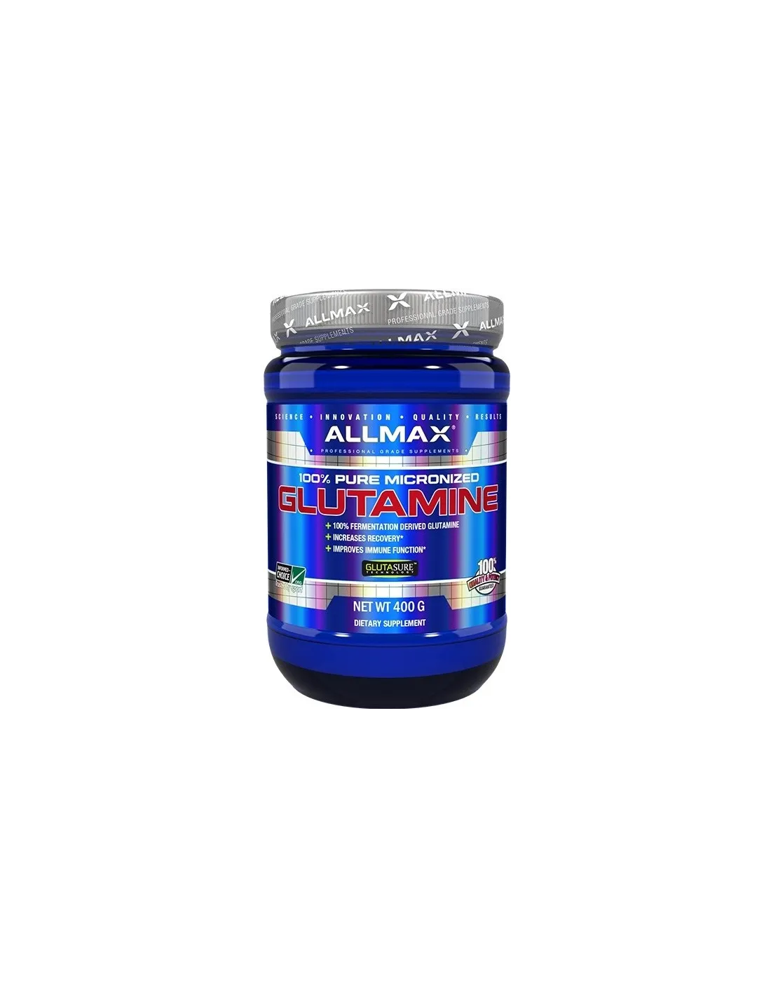 Prodotto con le materie prime più pure in uno stabilimento di produzione. La glutammina micronizzata ALLMAX Nutrition fornisce il recupero dopo l'allenamento e migliora il sistema immunitario, che può essere compromesso durante l'esercizio fisico intenso. ALLMAX utilizza un processo di iperparticolazione brevettato chiamato tecnologia GLUTASURE ™ per ridurre al minimo le dimensioni delle particelle della glutammina, creando una polvere pulita, bianca ed estremamente fine. Questo aumenta il tempo di sospensione della Glutammina nel liquido e accelera l'assorbimento nel flusso sanguigno. ALLMAX utilizza solo materie prime purissime e non è riscaldato o trattato chimicament