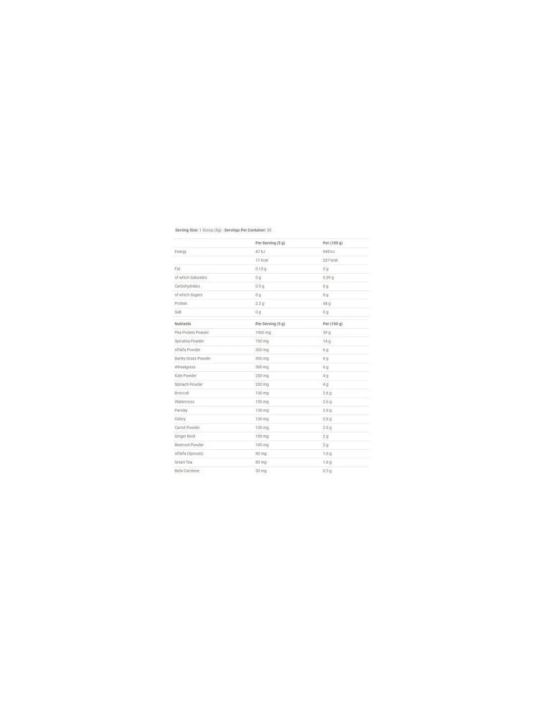 Altri ingredienti: Proteine di pisello in polvere, Spirulina in polvere, Erba medica in polvere, Erba d'orzo in polvere, Erba di grano in polvere, Cavolo nero in polvere, Spinaci in polvere, Broccoli, Crescione, Prezzemolo, Sedano, Carota in polvere, Zenzero, Barbabietola in polvere, Erba medica (germogli), Tè verde, Beta Carotene. ALLERGENI vedere gli ingredienti in grassetto. Può contenere anche: Frutta a guscio, latte, glutine, uova, soia e arachidi.