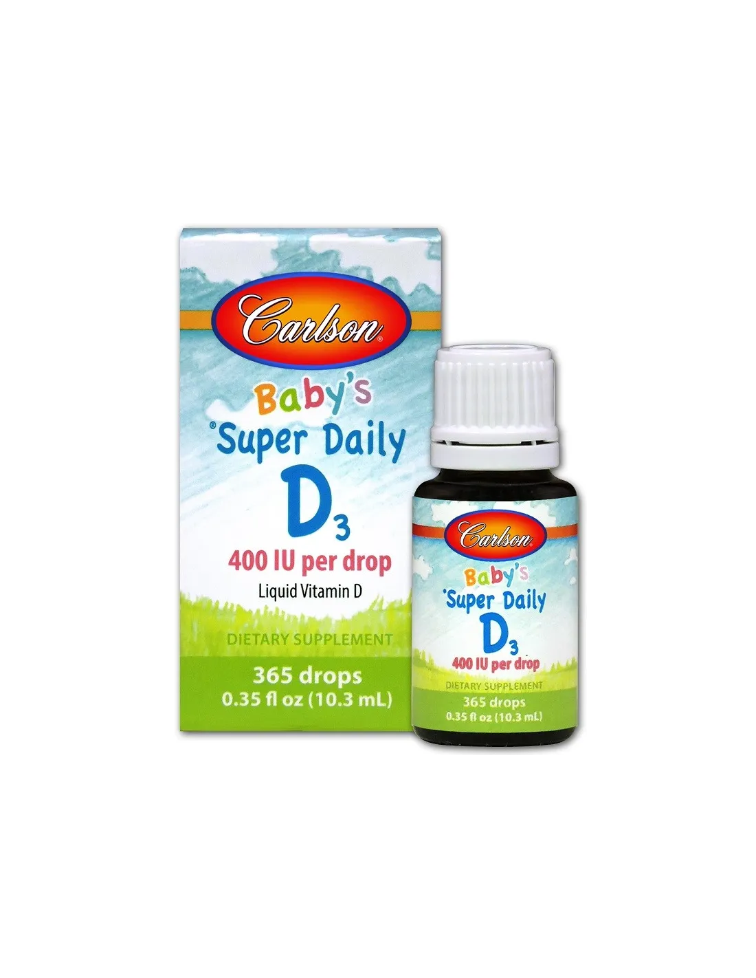 Carlson Labs Baby's Super Daily D3 fornisce ai bambini la vitamina D3 essenziale sotto forma di comode gocce. Spesso il latte materno e la formula non forniscono una quantità sufficiente di vitamina D e l'esposizione al sole per i bambini al di sotto dei 6 mesi non è raccomandata.