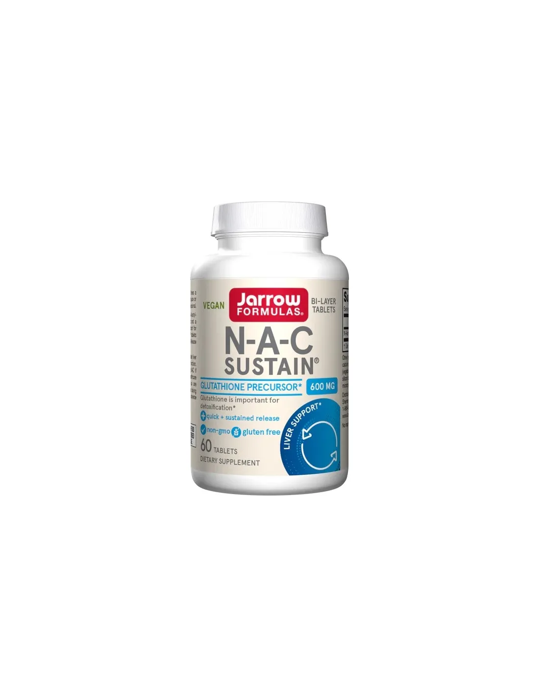 Jarrow Formulas N-A-C (N-Acetyl-L-Cysteine) Sustain è formulato con 600 mg di NAC per compressa, un potente amminoacido e precursore del glutatione. La formula di Jarrow Formulas utilizza una tecnologia a rilascio prolungato (doppio strato) che combina 1/3 a rilascio rapido e 2/3 a rilascio prolungato, garantendo supporto continuo durante la giornata per l'antiossidazione e la disintossicazione naturale dell'organismo.