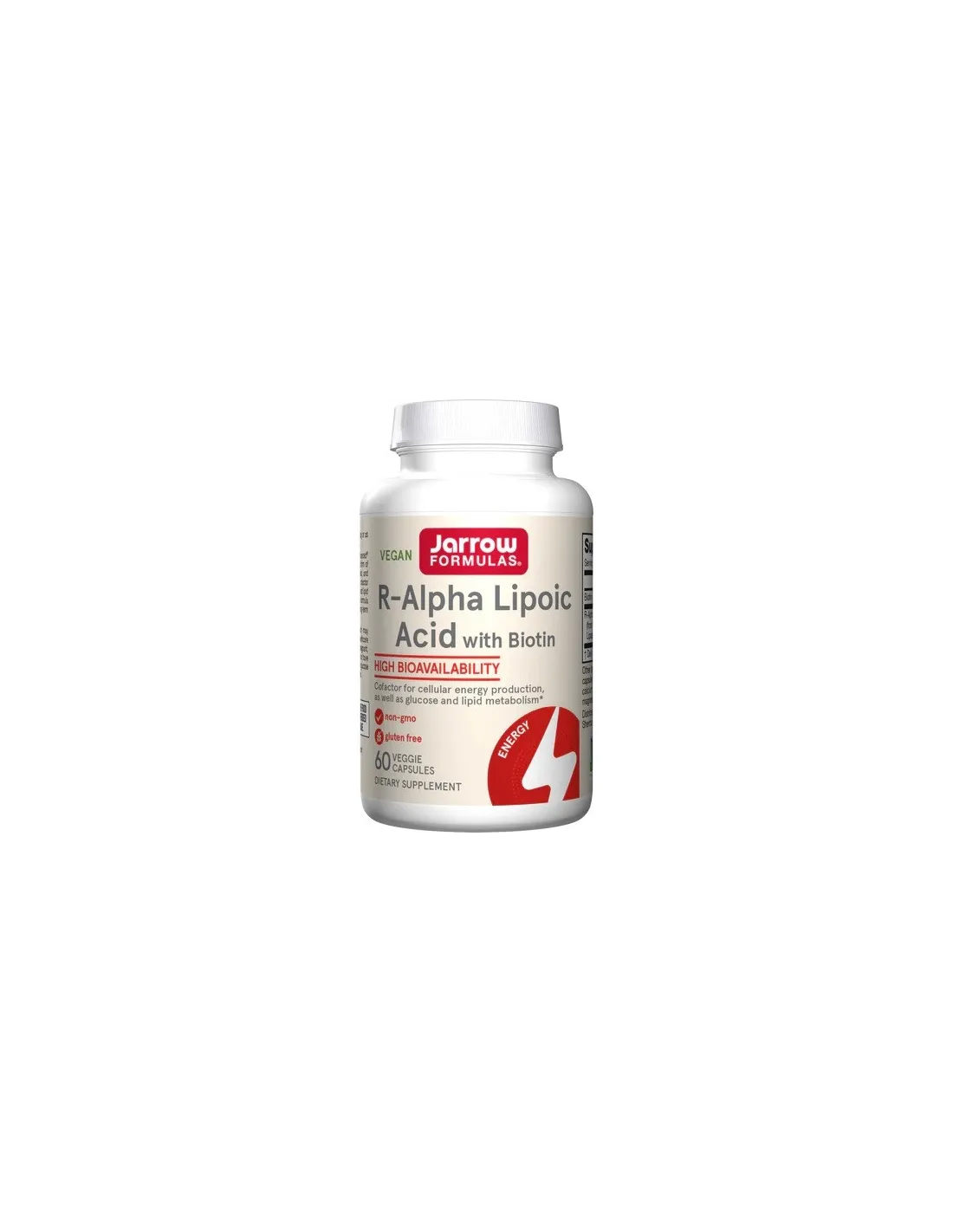 Scoprite i benefici dell'Acido R-Alfa Lipoico + Biotina di Jarrow Formulas, un integratore alimentare di qualità superiore progettato per migliorare la produzione di energia cellulare e l'efficienza metabolica con capsule vegetali vegan.