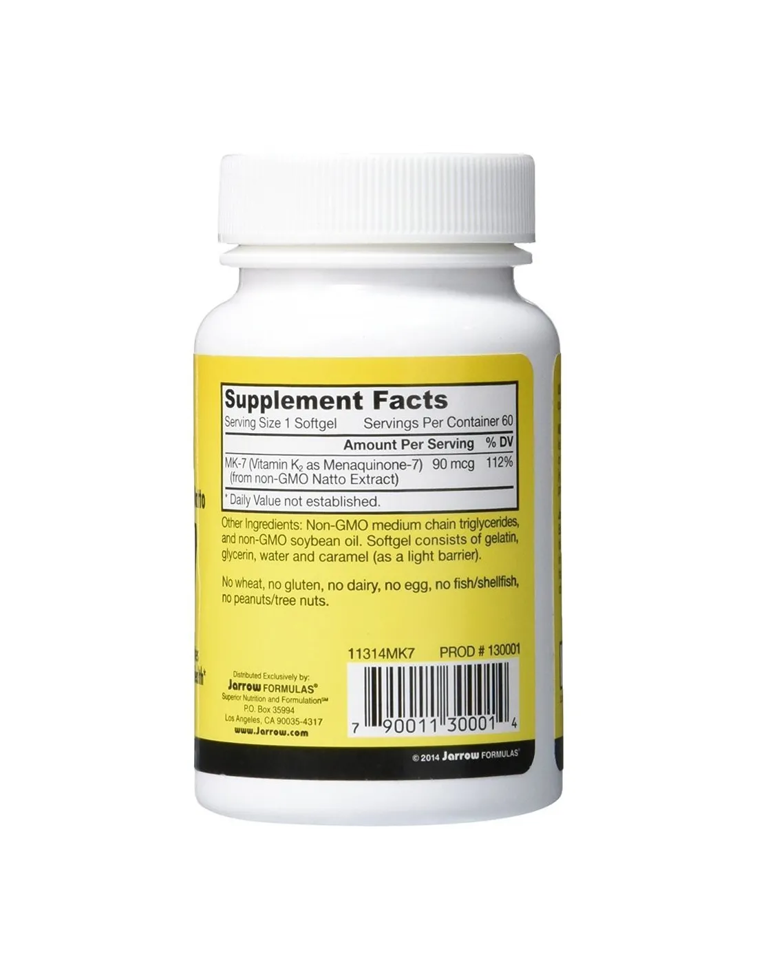 Jarrow MK-7 a base di Bacillus subtilis fermentato dal natto. MK-7 (Menaquinone-7) è una forma bioattiva rafforzata di vitamina K2 che si trova naturalmente nel Natto che viene assorbita molto meglio rispetto alla K1 da spinaci. MK-7 è responsabile della carbossilazione di proteine ossee specifiche necessarie per la costruzione di ossa.