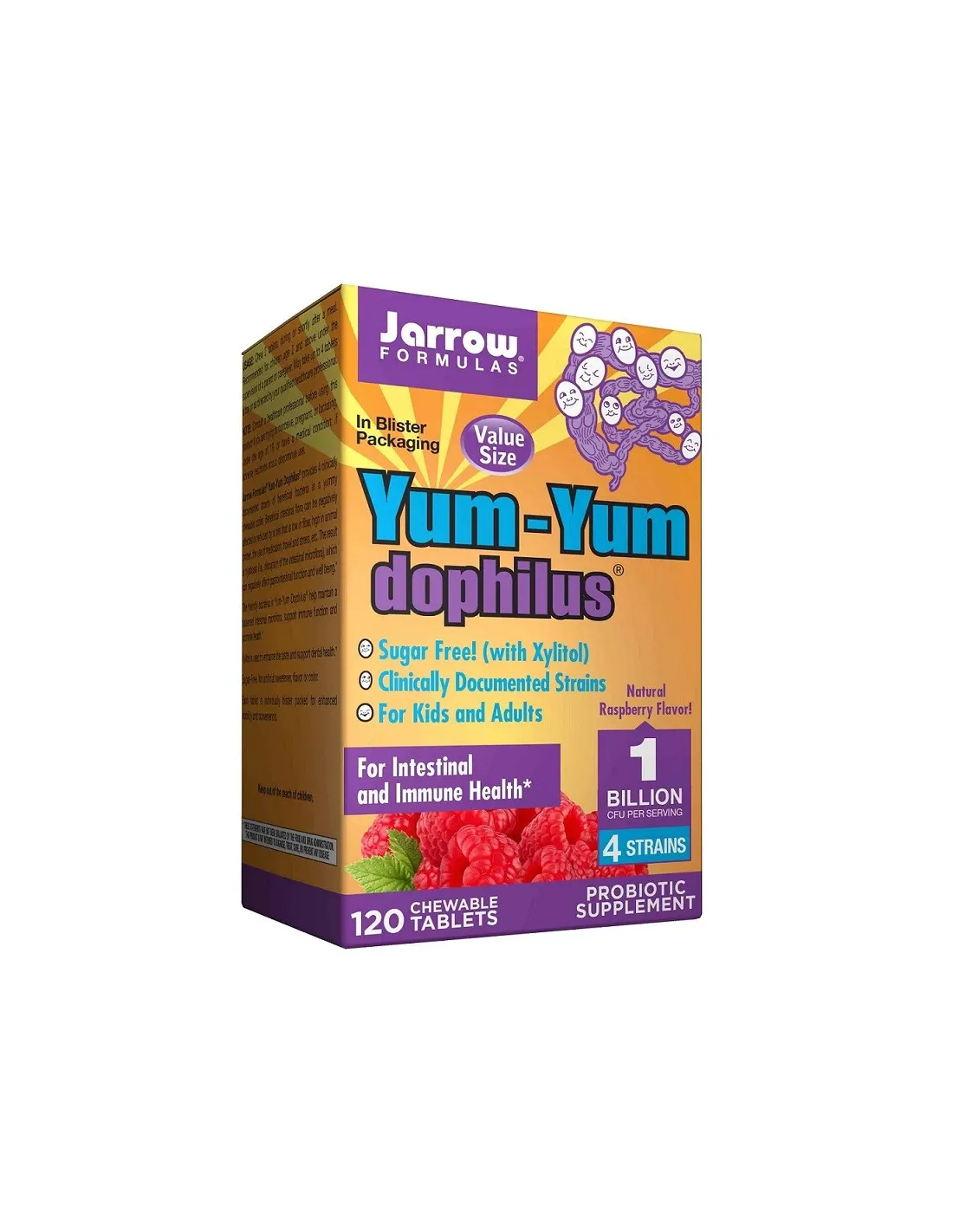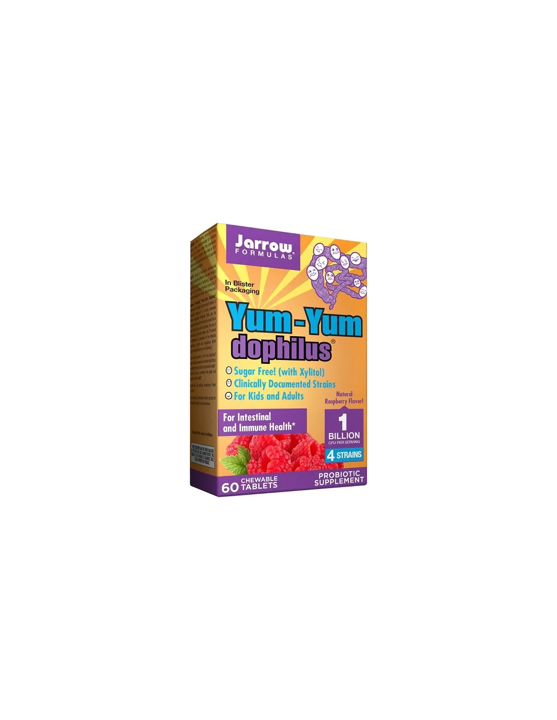 Jarrow Formulas Yum-Yum Dophilus è una deliziosa compressa masticabile al gusto di lampone, progettata per sostenere la salute dell'apparato digerente con una miscela brevettata di 4 ceppi probiotici clinicamente validati. Questi batteri benefici aiutano a ripristinare l'equilibrio della flora intestinale, particolarmente importante per chi soffre di disturbi digestivi dovuti a fattori quali diete povere di fibre, stress, viaggi o uso di farmaci.