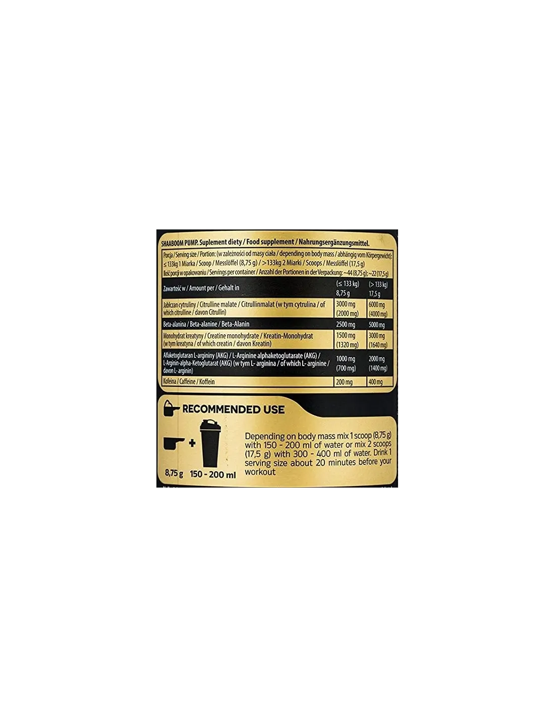 Assumere 1 misurino di Shaaboom Pump juice mescolato con 150-200 ml d'acqua circa 20 minuti prima dell'allenamento o del workout per ottenere il massimo pompaggio e prestazioni durante la sessione di esercizio.