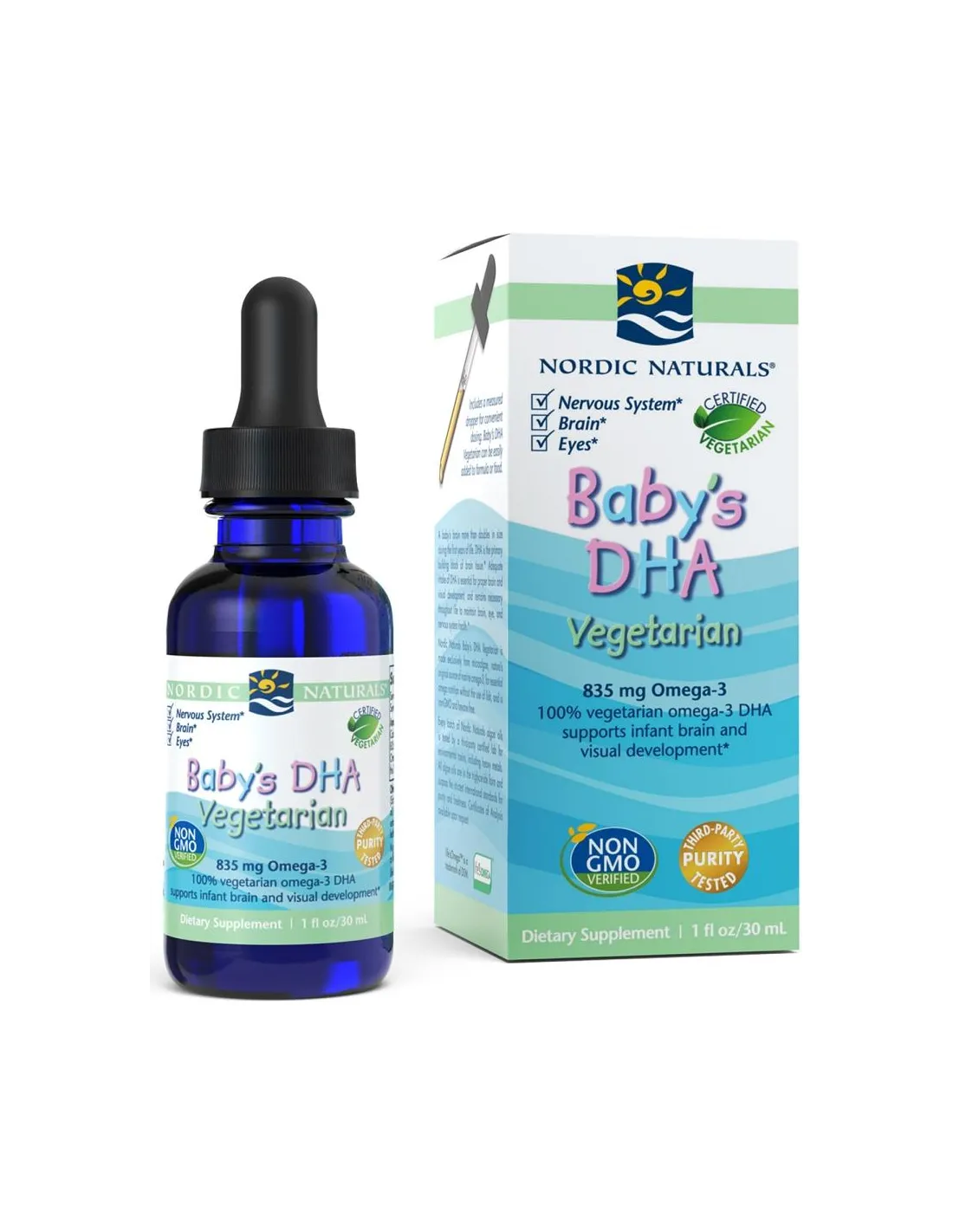 Nordic Naturals Baby's DHA Vegetarian è una fonte vegetariana pura, sicura e certificata del DHA omega-3 di cui il tuo bambino ha bisogno.