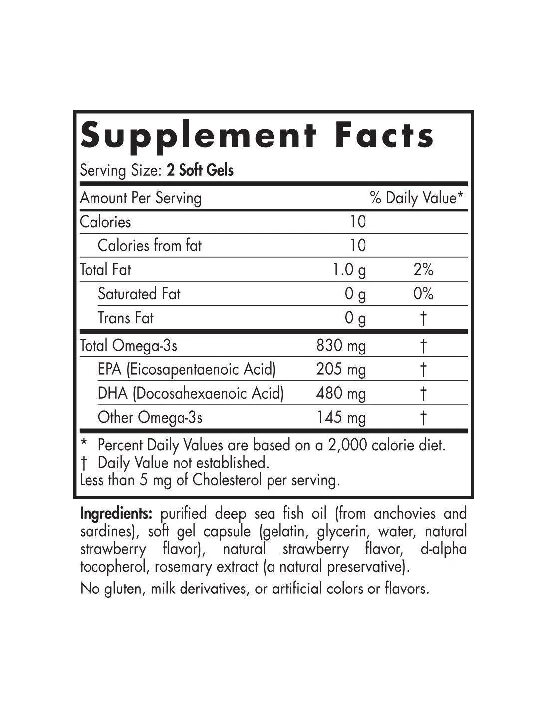 Altri ingredienti: Olio di pesce d'alto mare purificato (da acciughe e sardine), capsula di gel morbido (gelatina, glicerina, acqua, aroma naturale di fragola), aroma naturale di fragola, d-alfa tocoferolo (antiossidante), estratto di rosmarino (conservante naturale).