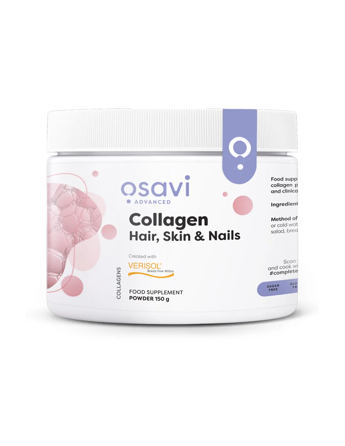 Collagen Hair, Skin and Nails di Osavi contiene peptidi di collagene bioattivi VERISOL® brevettati e clinicamente testati, che favoriscono il metabolismo della pelle, una crescita più rapida delle unghie e una migliore condizione dei capelli. Studi clinici hanno confermato che l'integrazione con peptidi di collagene bioattivi contribuisce ad aumentare l'elasticità della pelle, a ridurre la quantità di rughe, ad aumentare l'idratazione della pelle e a prevenire la cellulite, con il risultato di una bella pelle soda, indipendentemente dall'età. Migliora i capelli, rendendoli più forti e resistenti alla rottura. Il collagene aiuta le unghie a crescere più velocemente, più forti e ne riduce la fragilità [1,2,3].