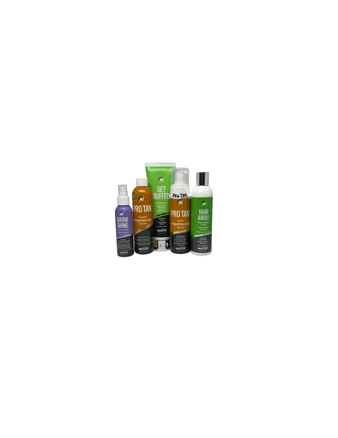 Il cuore di questo straordinario kit è rappresentato da Pro Tan Overnight Competition Color, un color base coat specializzato incaricato di fornire al corpo la pigmentazione ideale di cui la pelle ha bisogno durante le competizioni; questa formula competition color super dark fornisce la perfetta abbronzatura per un periodo da 5 a 7 giorni senza preoccuparsi di effetti collaterali o segni sulla pelle. La Instant Physique Bronze Mousse è una schiuma abbronzante ideale per i ritocchi finali come color top coat prima della gara; grazie alla sua capacità di asciugarsi rapidamente, può essere applicata pochi minuti prima di salire sul palco, lasciando un risultato finale incredibile. Infine, lo Show Shine è un olio di applicazione topica utilizzato per evidenziare la definizione dei muscoli del corpo, evidenziando così una perfetta visibilità dello stato fisico e della massima definizione che l'atleta ha in competizione, garantendo i migliori risultati.