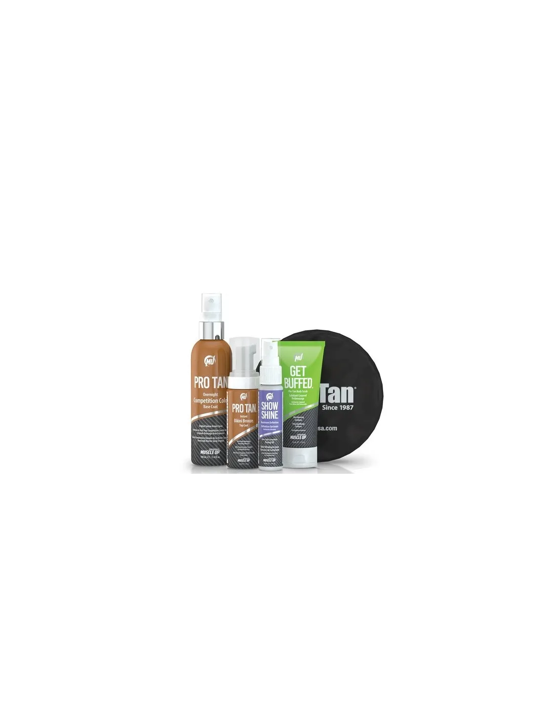 Questo kit contiene tutto il necessario per una competizione. Include Get Buffed® Pre-Tan Skin Balancing Exfoliator per preparare la pelle, Pro Tan® Overnight Competition Color Base Coat per fornire un colore di base, Pro Tan® Instant Top Coat Mousse per dare una bella finitura, Show Shine® Ultra-Light Competition Posing Oil per evidenziare i muscoli e una spugna applicatrice per una facile applicazione.