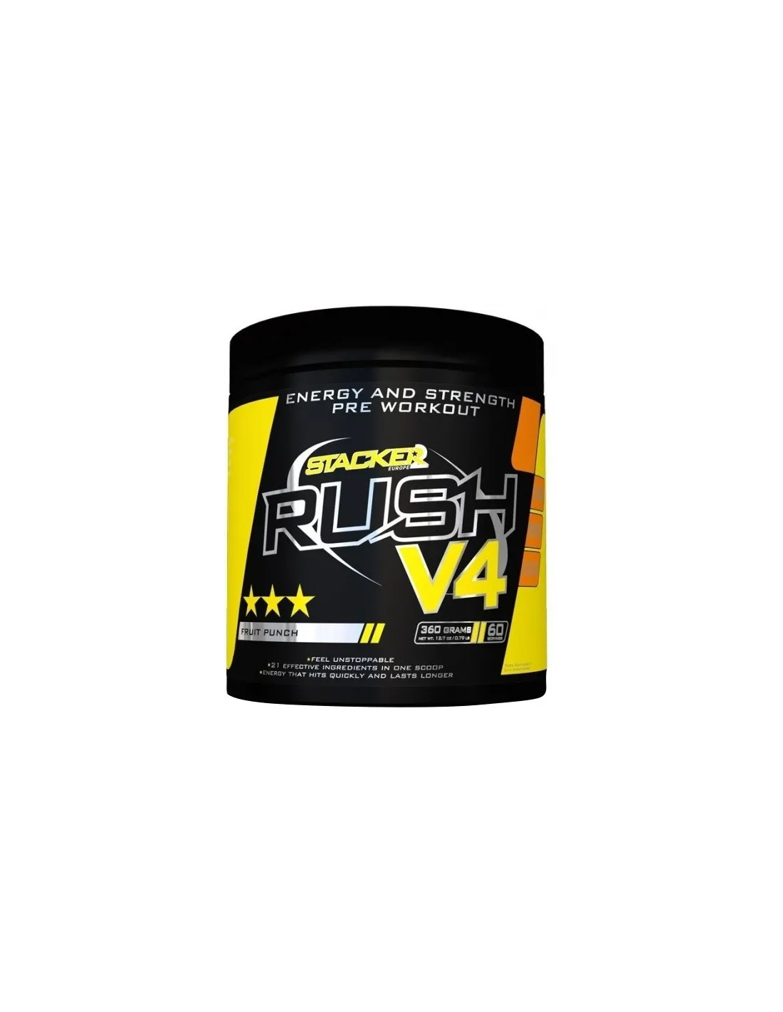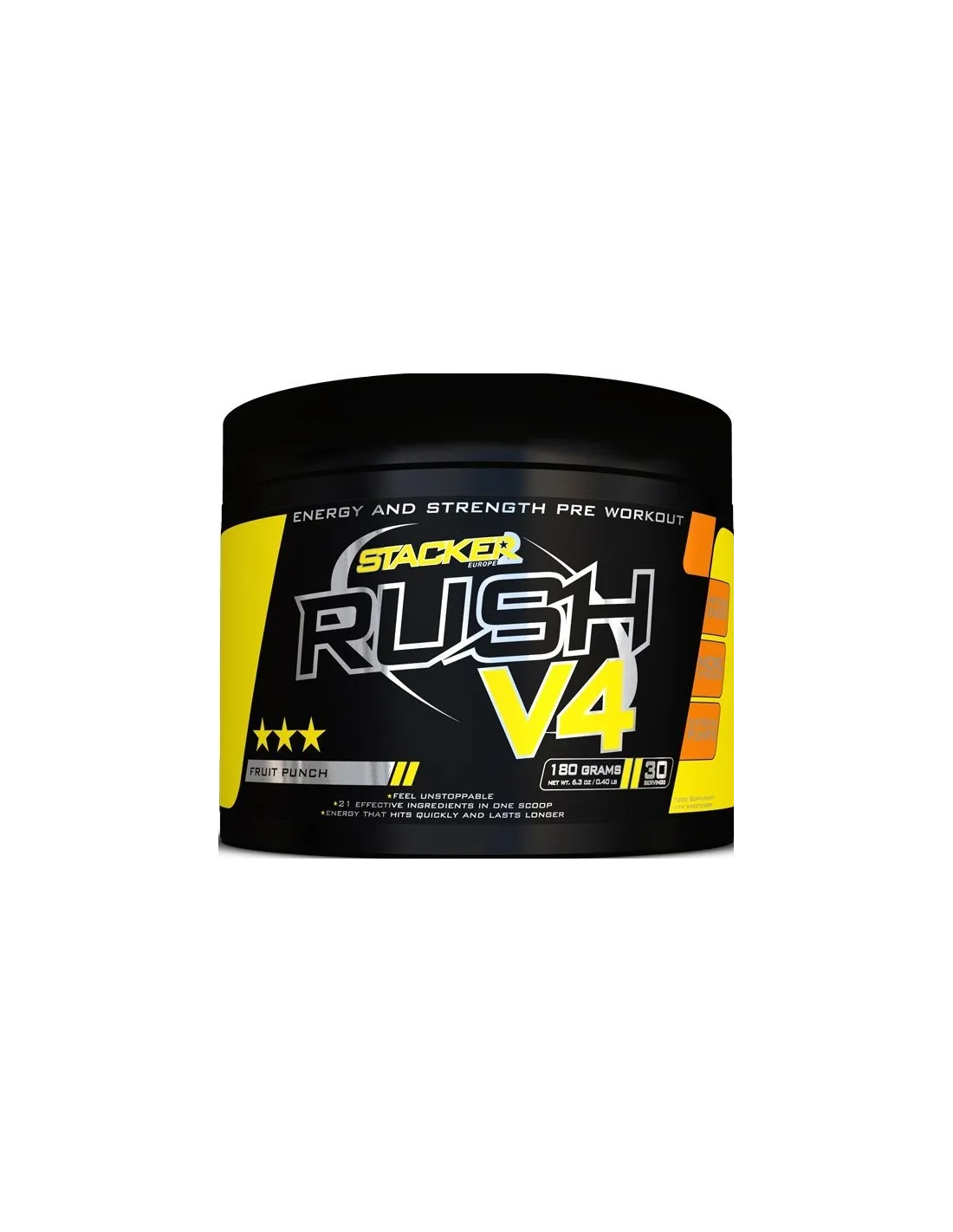 RUSH V4 ti offre: 21 ingredienti efficaci in un solo misurino. Incredibile energia e concentrazione di lunga durata. Pompe estreme. Dosi efficaci di ingredienti scientificamente provati. Un pre-allenamento in 6 deliziosi gusti di frutta.