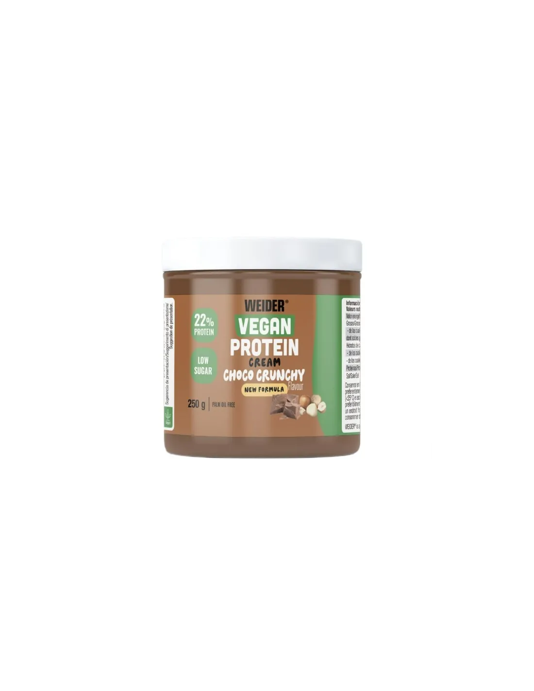La CREMA VEGANA DI PROTEINE di WEIDER è una deliziosa crema spalmabile con proteine di pisello di qualità, pensata per regalarvi un momento di piacere mentre vi prendete cura della vostra linea, visto che non contiene olio di palma nella sua formula. Le creme al cioccolato sono una bomba di zucchero e per questo motivo, se vi piace prendervi cura di voi stessi, le avrete sicuramente eliminate dalla vostra dieta per molto tempo. Quel tempo è passato, perché le creme proteiche vegane non contengono zuccheri aggiunti e sono state realizzate con oli vegetali di karité e di girasole. L'aspetto più caratteristico e speciale delle creme proteiche vegane è il loro contenuto proteico. Sono state arricchite con proteine isolate di pisello per contenere il 22% di proteine. Le proteine sono un nutriente essenziale per il mantenimento e lo sviluppo dei muscoli e favoriscono il senso di sazietà. La crema proteica vegana è ideale per tutti i tipi di diete e obiettivi: se il vostro obiettivo è l'aumento della massa muscolare e siete nella fase di volume, questa crema vi aiuta a fornire gli aminoacidi essenziali ai vostri muscoli in modo delizioso. Se siete a dieta e volete mantenere la linea, la crema proteica vegana è un delizioso spuntino ricco di proteine e povero di carboidrati e zuccheri. Prendersi cura di sé non è mai stato così facile e gustoso!